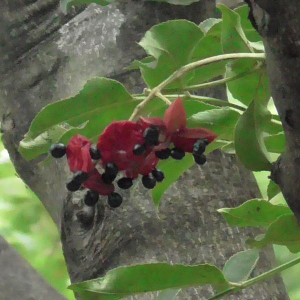ゴンズイの実は、赤い袋と中から顔を出す黒い種子のコントラストが目を引きます。