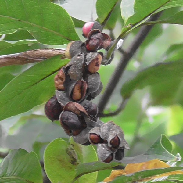 コブシの実は、あたかも「握り拳」のような形です。熟して裂けて、赤い種子が顔を出しています。