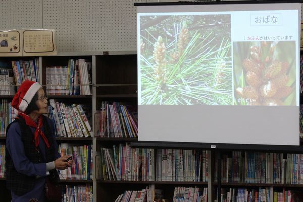 春にマツの雄花と雌花が咲いて、1年半後の秋に球状にうろこ状の鱗片が集まり、その間に小さな種が実るまでをパワーポイントによる映像と、実物を示しながら説明しました。