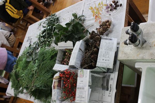 スタッフが集めた沢山の木の実と常緑樹の小枝など材料の説明と、作り方のコツ、安全な道具の扱い方などの説明します。