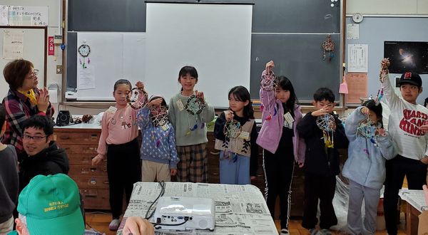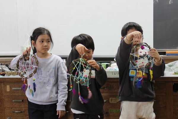 前半のプログラムは「ドリームキャッチャー作り」。ネイティブアメリカンに伝わるお守り(魔除け)で、悪い夢を取り去り、良い夢だけを眠る人に届けるとされています。パワーポイントを使って説明しました。