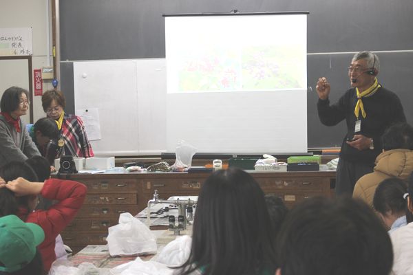 後半のプログラムは「オナモミで魚釣り」。初めに動物や人間にひっついて遠くに運ばれる「ひっつき虫」と呼ばれる植物の実や種子について、エックス山で見られる身近な植物を例に、鉤・トゲ等のひっつく仕組みを説明しました。
