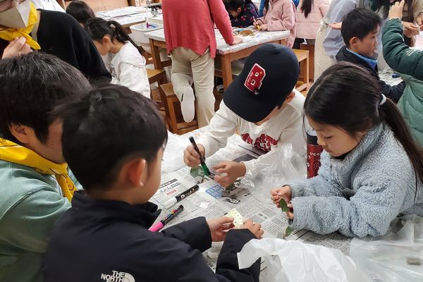 その後は、お待ちかね、魚釣り大会です。まず、各自がエックス山で採取した葉っぱにシールの目をはり、ポスカで鱗など思い思いの絵を描いて魚を作りました。口元にスポンジを貼り付ければ完成。