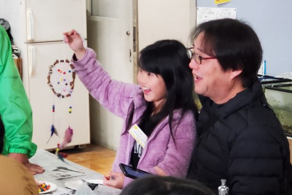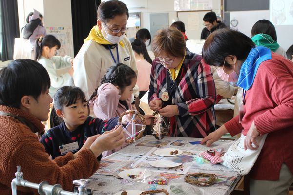 その後、製作に入ります。予め葛の蔓で作っておいたリースに糸を網状に張り、ウッドビーズや鳥の羽根で飾り付けます。それぞれビーズの色や飾り方を工夫して、作業に夢中です。