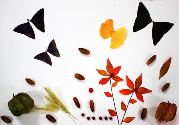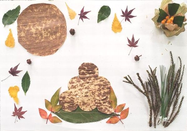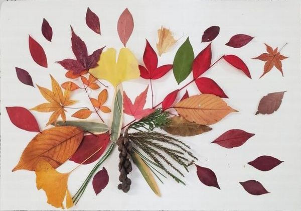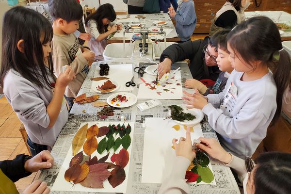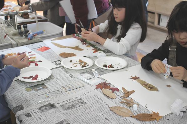 白い紙のキャンバスの上に思い思いに葉っぱや木の実を置いて、ボンドやグルーガンで接着していきます。作りながら構想がひろがり、何度も、材料を探しに行きます。保護者の方々も、子供たちと一緒になって、作品づくりを楽しんでいるように見えました。