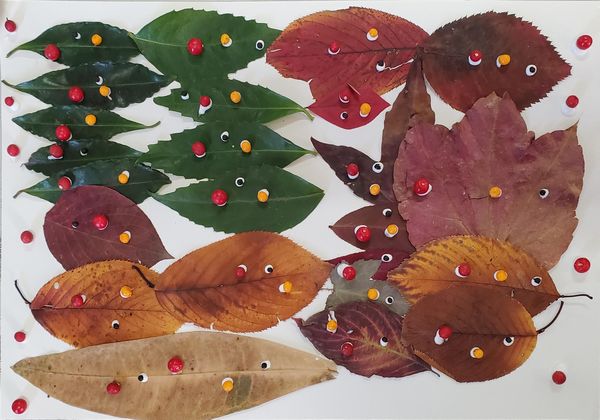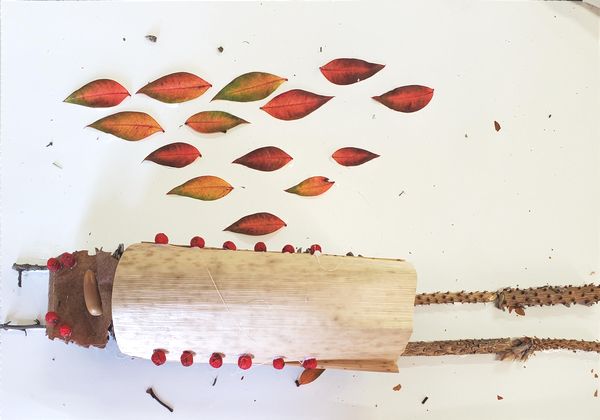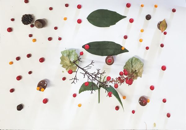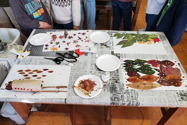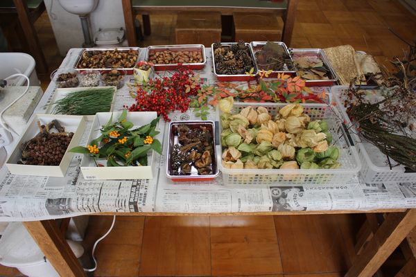 スタッフが集めた赤や緑の葉っぱや赤い木の実が机の上に準備されていました。