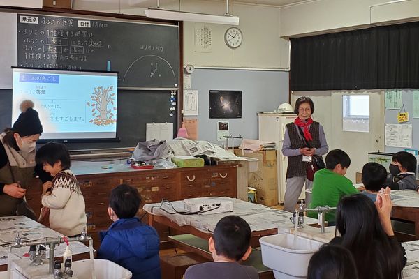 まず、木の冬越しです。秋に葉が落ちるしくみと、葉と花の冬芽についてパワーポイントで説明した後、実際に冬芽を切って観察しました。