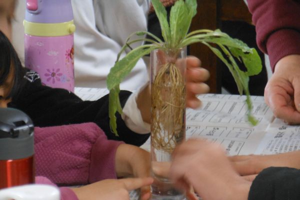 その後は、草の冬越しです。色々な冬越しのしかたを説明した後、ロゼットで冬越しする植物のサンプルを観察しました。地上部は、葉が地面にへばりついているのに、地中では、根がしっかりと伸びています。