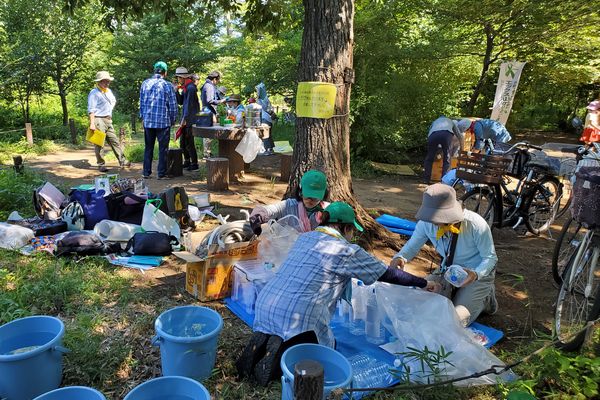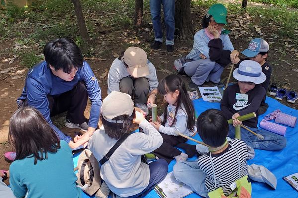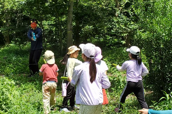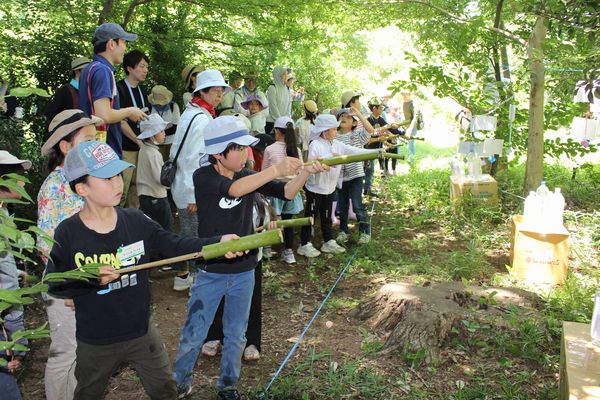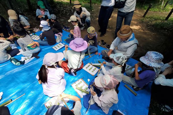 7月のプログラムは、「おもしろい植物」と「竹水鉄砲作り」。後半の竹水鉄砲の的のペットボトルを準備しています。