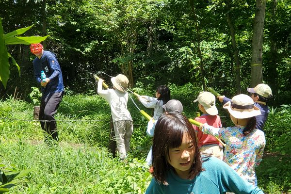 やや、スペシャルゲスト?の鬼が登場してきました。みんなで追いかけて、水合戦です。鬼も反撃しますが、多勢に無勢、子供たちが優勢です。大興奮でした。広場に歓声が響き、夏休みの幕開けに相応しいイベントとなりました。