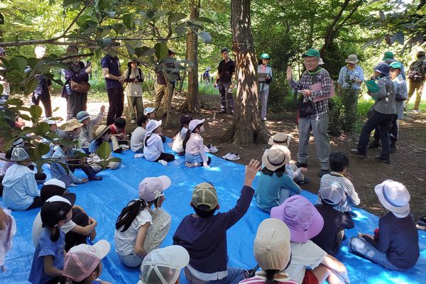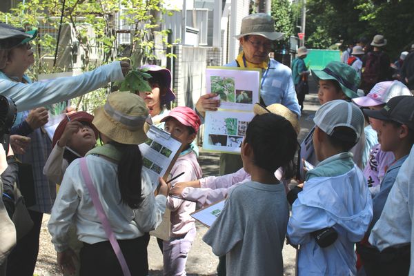 まず、班毎に、スタッフが作った「エックス山にある 人が使ってきた植物」のシートを手に、植物を探して回りました。