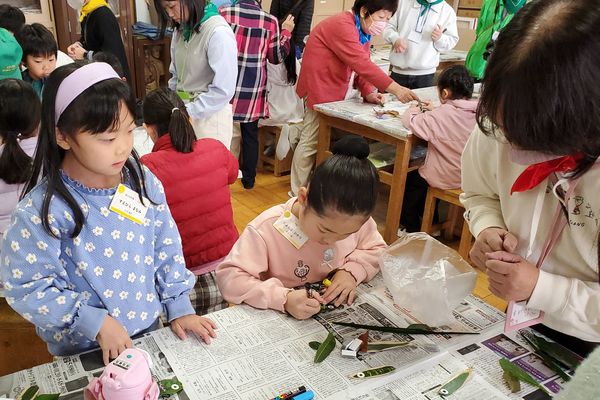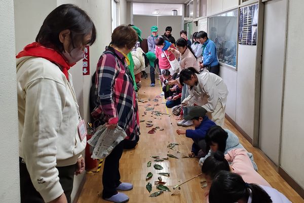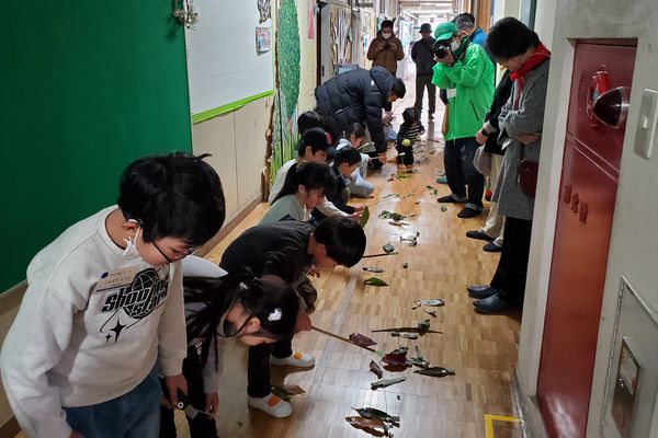 川に見立てた廊下に葉っぱの魚を放し、ひっつき虫の一つであるオナモミの実を針代わりにして作った釣竿で釣り上げます。17匹も釣る猛者もいて、歓声があがりました。