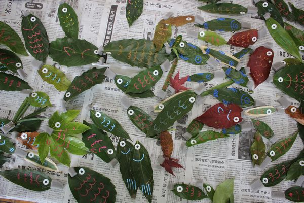 その後は、お待ちかね、魚釣り大会です。まず、各自がエックス山で採取した葉っぱにシールの目をはり、ポスカで鱗など思い思いの絵を描いて魚を作りました。口元にスポンジを貼り付ければ完成。
