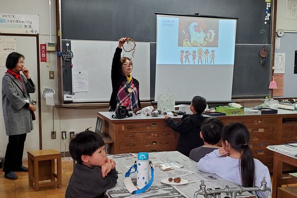 前半のプログラムは「ドリームキャッチャー作り」。ネイティブアメリカンに伝わるお守り(魔除け)で、悪い夢を取り去り、良い夢だけを眠る人に届けるとされています。パワーポイントを使って説明しました。