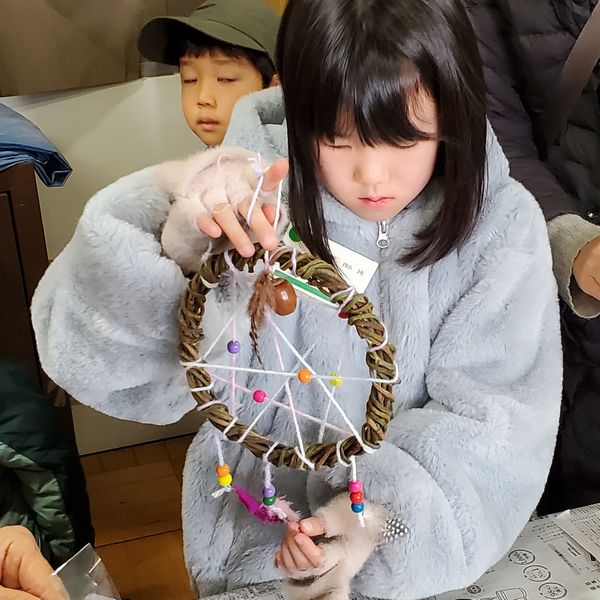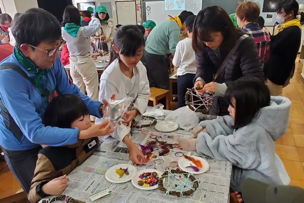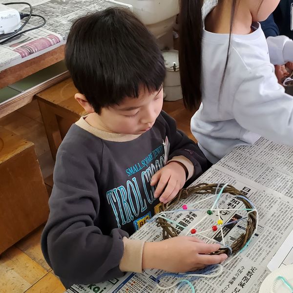 その後、製作に入ります。予め葛の蔓で作っておいたリースに糸を網状に張り、ウッドビーズや鳥の羽根で飾り付けます。それぞれビーズの色や飾り方を工夫して、作業に夢中です。