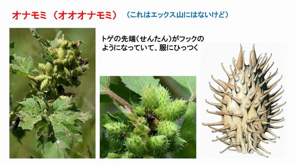 先月のプログラムに対し、「オナモミはどのようにしてひっつくか」という質問が多くありました。オナモミの実の拡大の絵で引っかかり方を説明してから、実際の実をルーペで観察しました。