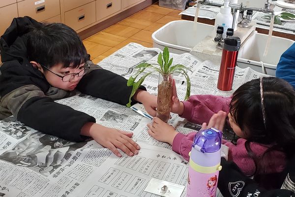 その後は、草の冬越しです。色々な冬越しのしかたを説明した後、ロゼットで冬越しする植物のサンプルを観察しました。地上部は、葉が地面にへばりついているのに、地中では、根がしっかりと伸びています。