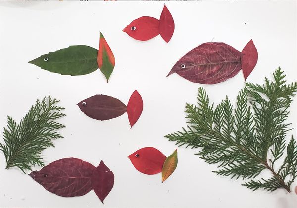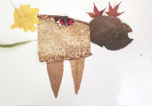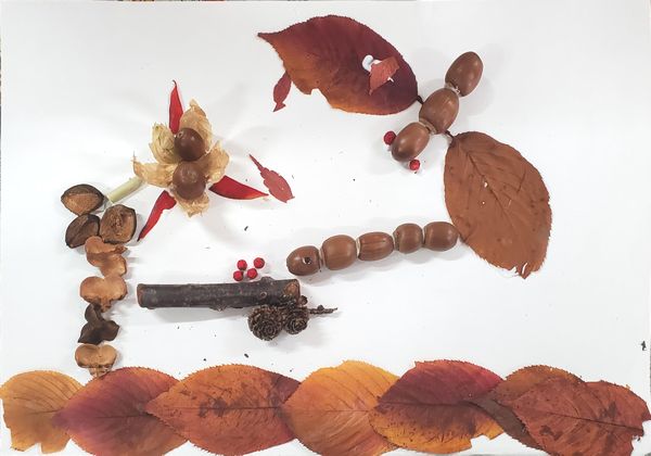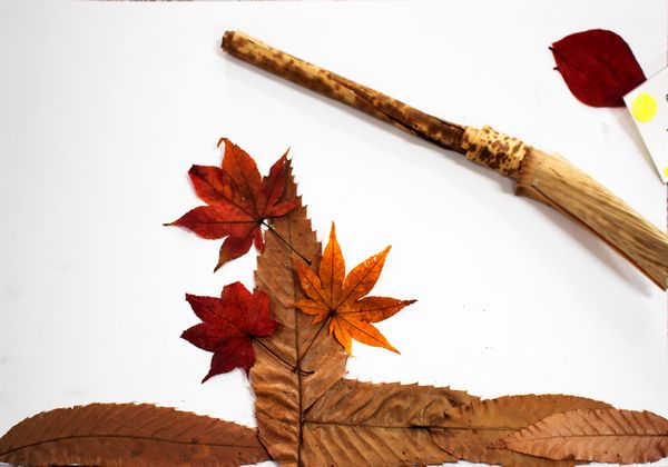 白い紙のキャンバスの上に思い思いに葉っぱや木の実を置いて、ボンドやグルーガンで接着していきます。作りながら構想がひろがり、何度も、材料を探しに行きます。保護者の方々も、子供たちと一緒になって、作品づくりを楽しんでいるように見えました。