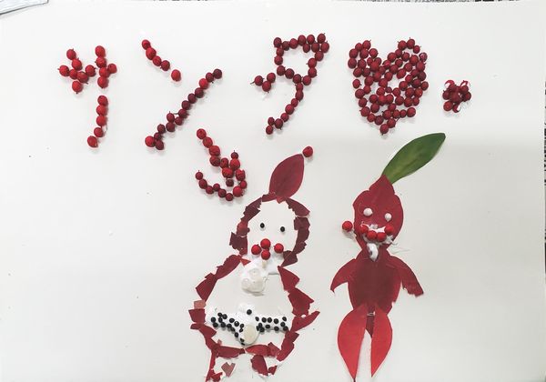 スタッフが集めた赤や緑の葉っぱや赤い木の実が机の上に準備されていました。