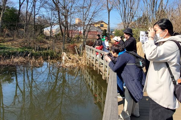 姿見の池緑地に着きました。まず、野鳥観察のマナーと姿見の池緑地で見られる野鳥の見分け方を詳しく学びました。