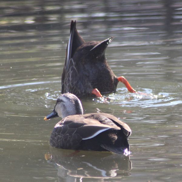 いよいよ野鳥観察です。2グループに分かれて、姿見の池と周辺の樹林地を交互に移動して観察します。姿見の池は、カラカラ天気の影響があり、環境はあまり良くなかったですが、カルガモが楽しそうに泳いでいて、池の周りでエサを求める鳥たちの姿も見つけることができました。